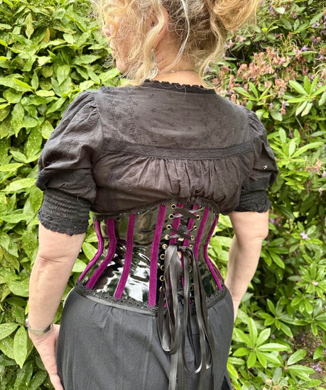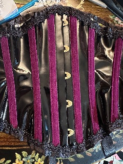 Daring, decadent, and undeniably seductive—the Midnight Vixen Corset is a statement in contrast and texture. Crafted from jet-black patent leather that gleams with a mirror-like sheen, this corset commands attention with every curve. Vertical channels of rich violet velvet run down the body, drawing the eye and sculpting the waistline in bold, sultry lines.