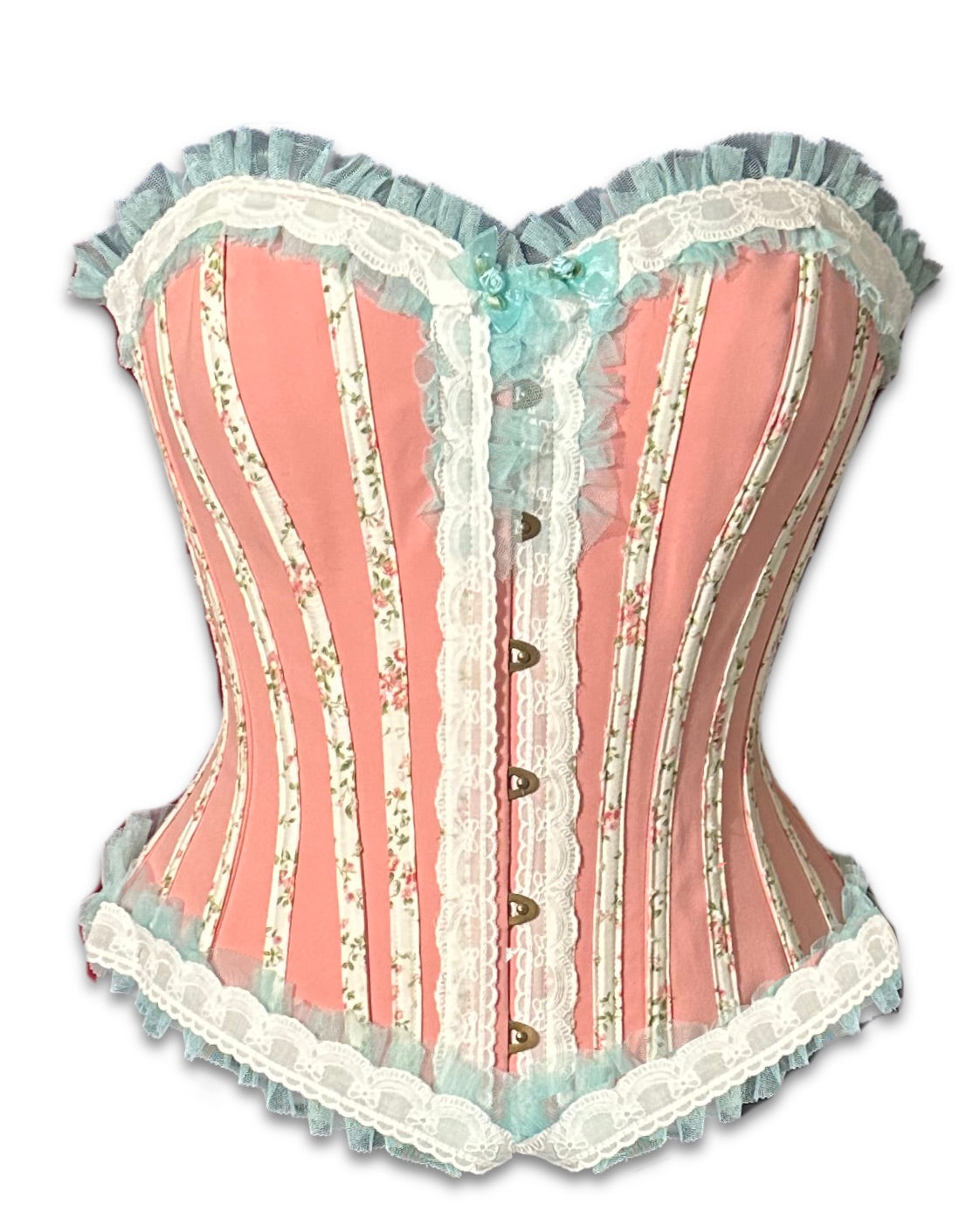 Delicate yet grounded, the Rosewood Ribbons Corset is a romantic nod to pastoral charm with a touch of boudoir grace. Crafted in soft rose-colored cotton, it’s trimmed with slender floral channels that frame the silhouette like garden trellises in bloom. Pale lace ruffles trace every edge, softened further by a whisper of teal ribbon and a petite bow nestled at the center.