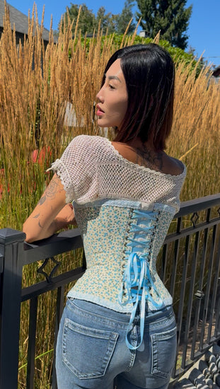 The Forget Me Not Corset is a tender tribute to the women who shaped the land and stitched their stories into every garment. Made from soft cotton and printed with a delicate scatter of wild blue flowers, this corset blends the romance of prairie days with timeless feminine strength.