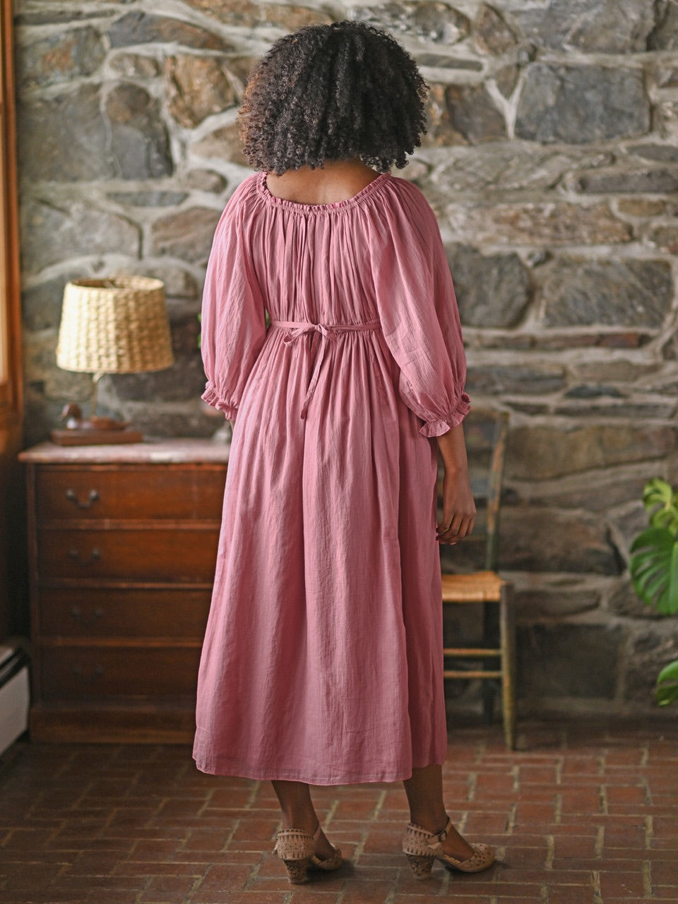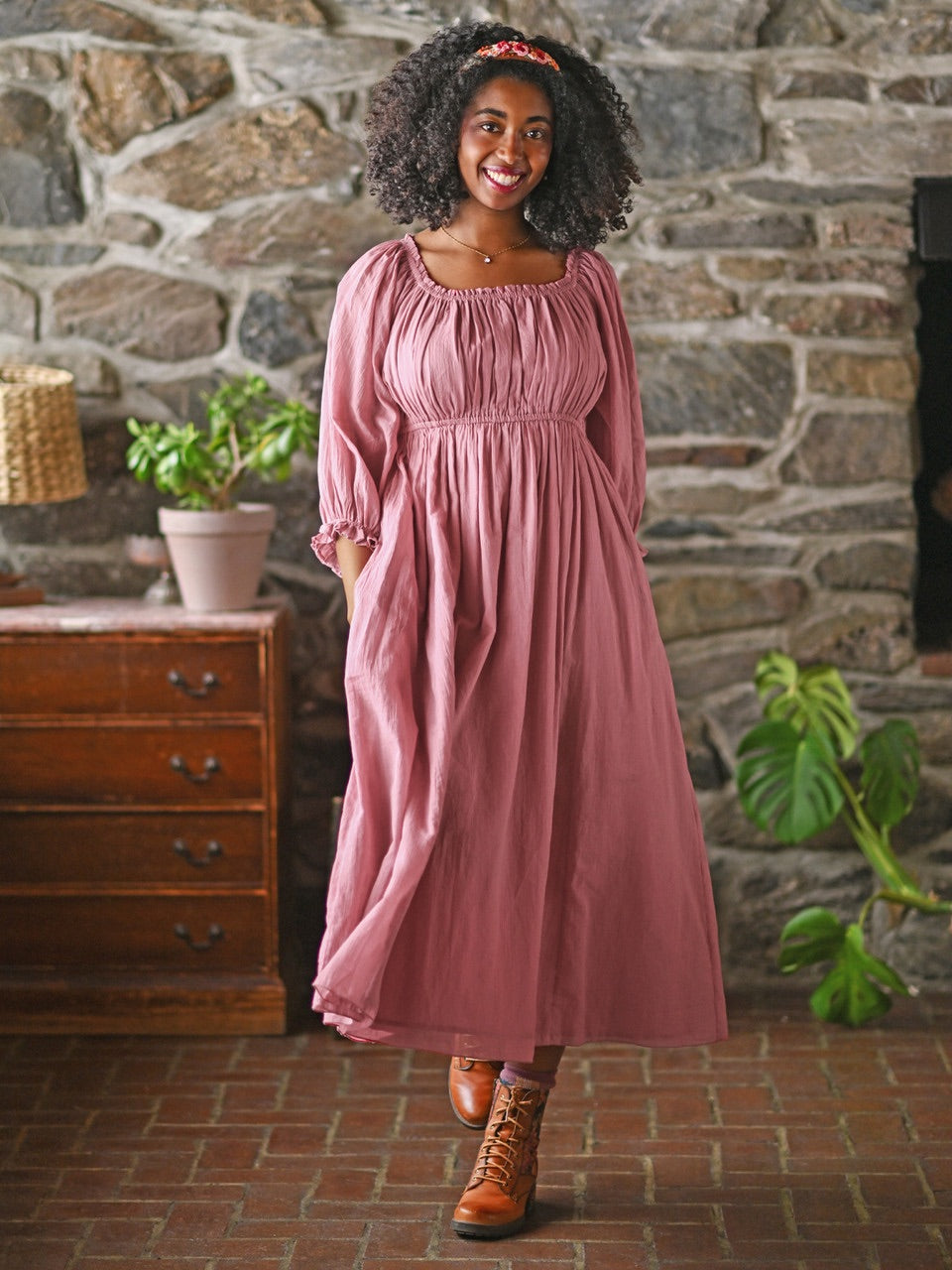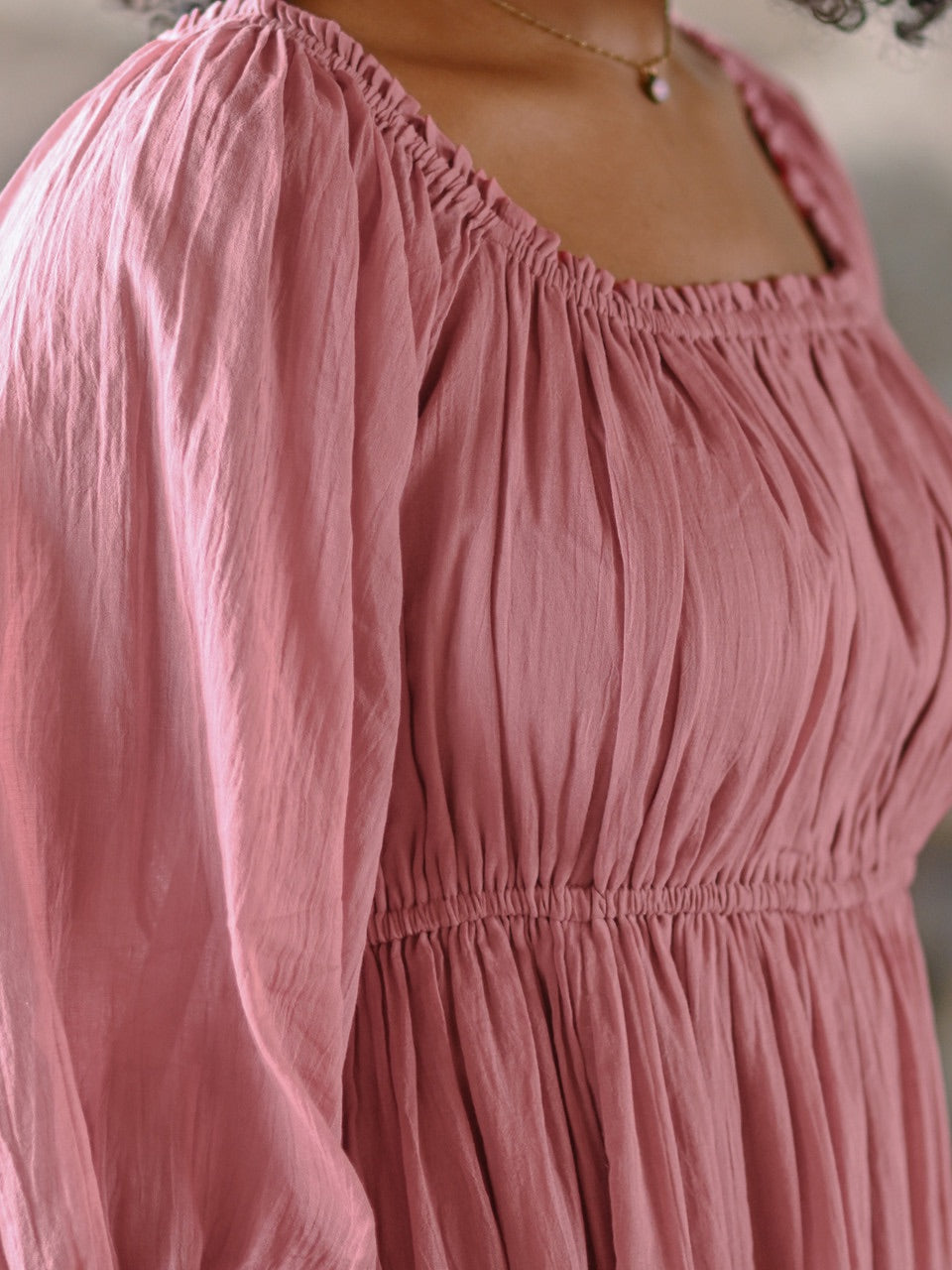 - Lightly elasticated neckline and waist to create a gathered bodice