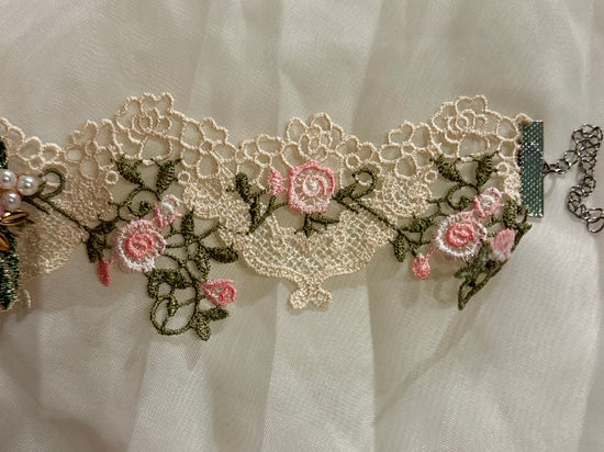 Embrace timeless romance with our exquisite lace necklaces adorned with soft pink roses and dainty pearl drops. Crafted from intricate floral lace, these feminine pieces drapes gracefully along the neckline, blending vintage charm with modern elegance.