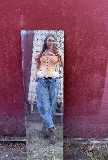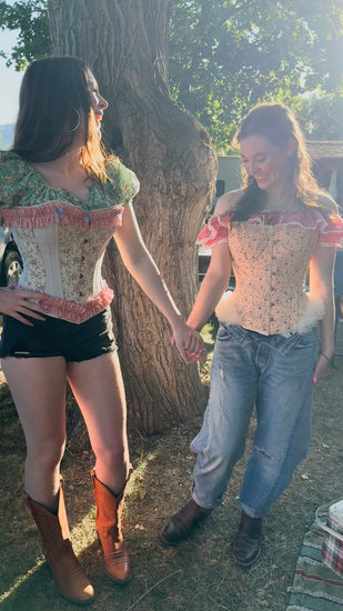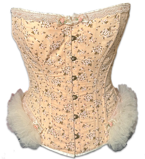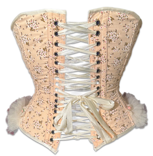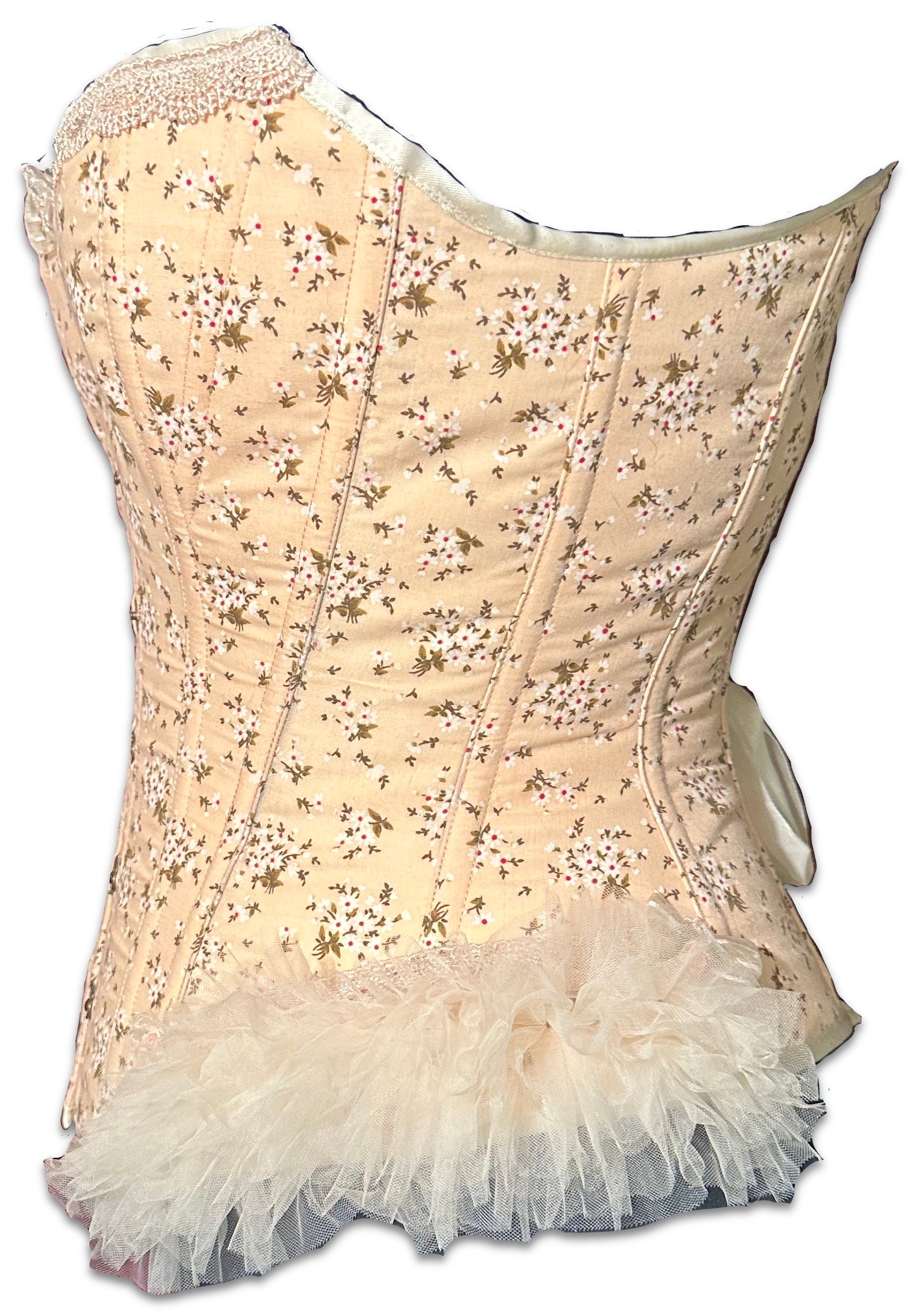 Playful and pastoral, this corset feels like sunshine over a blooming orchard. Lise's gentle charm and countryside whimsy are mirrored in the cheerful, blossom-dotted fabric.
