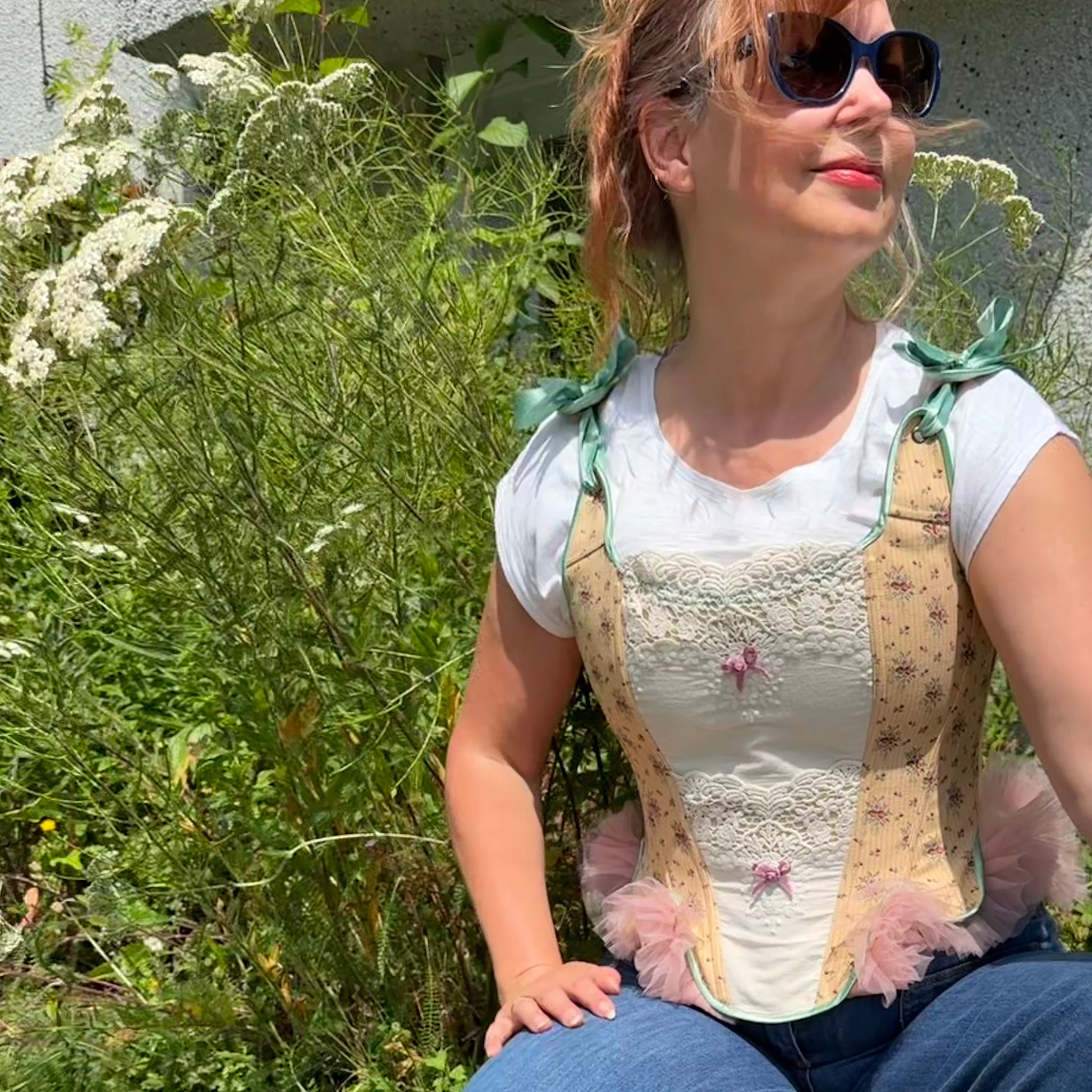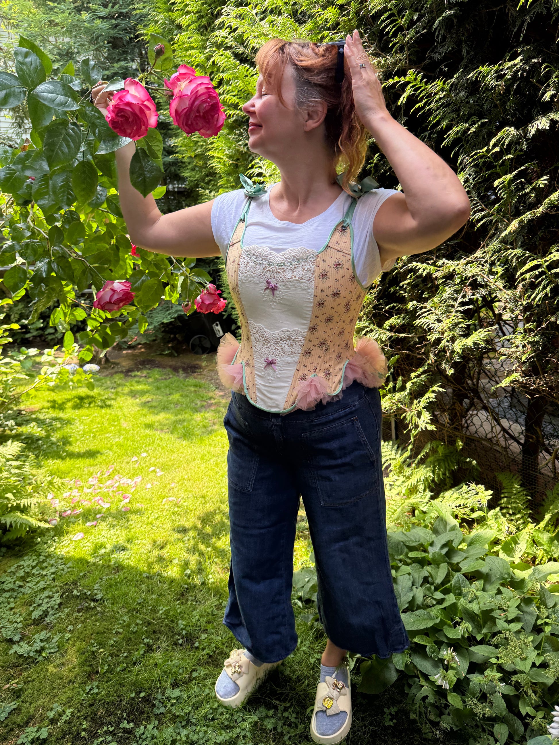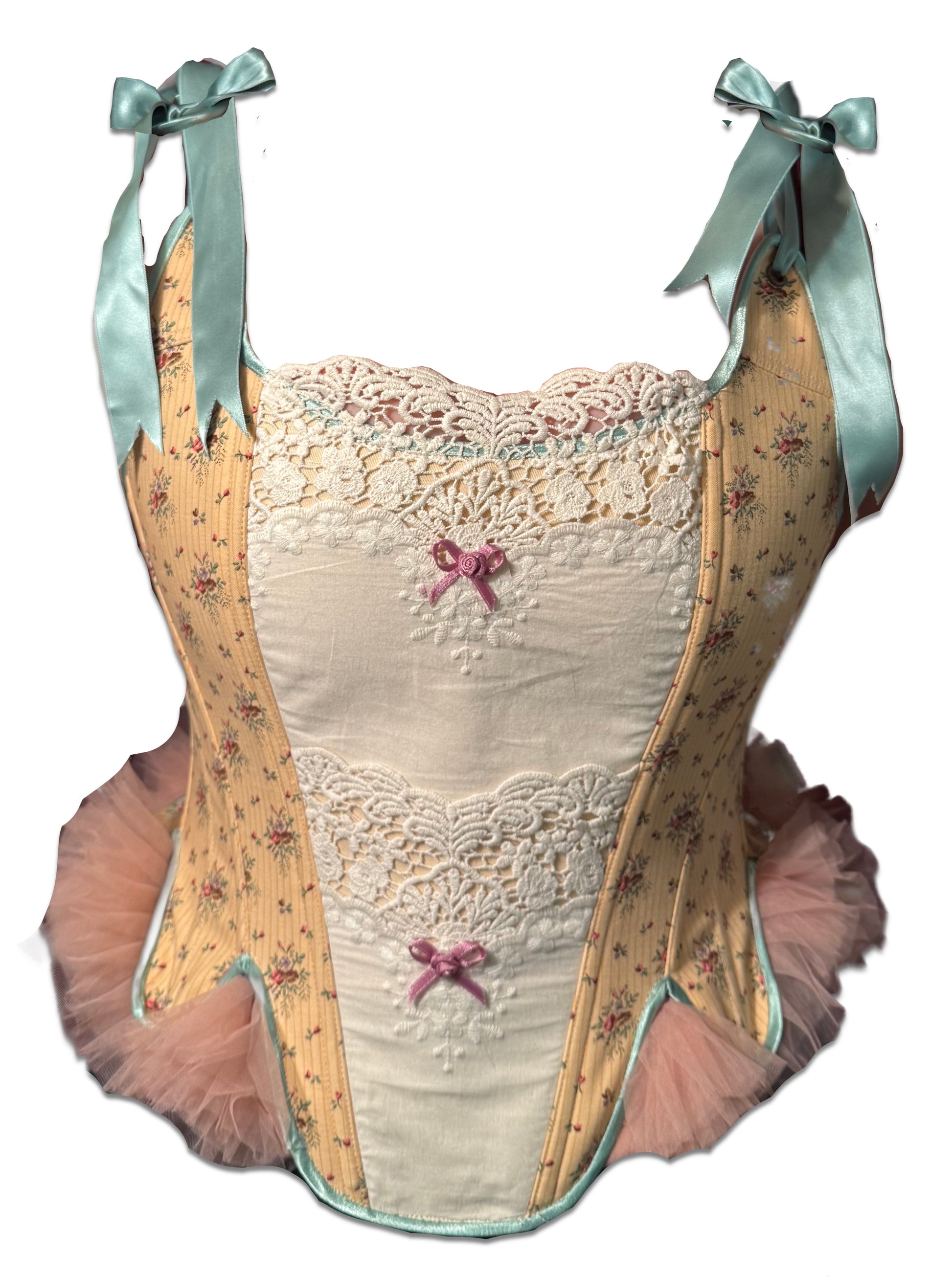 The corset is lined with a bonded cotton twill, ensuring durability, structure, and long-lasting wear. Ribbon ties on the shoulder straps and adjustable back lacing allows for a customized fit. Perfect for cosplay, historical fashion, cottage romance, or everyday elegance, this versatile corset can be worn on its own or layered over a T-shirt or peasant blouse for a more period-accurate look.