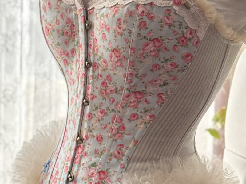 The pastel florals and cream lace suggest her sweetness and naiveté, while the pale blue background hints at her noble beauty and tragic arc. It is a corset she might wear on her journey from Amiens to Paris—caught between love and opulence.