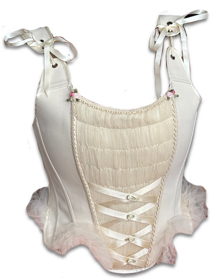 The corset is lined with a bonded cotton twill, ensuring durability, structure, and long-lasting wear. Ribbon ties on the shoulder straps and adjustable back lacing allows for a customized fit. Perfect for cosplay, historical fashion, cottage romance, or everyday elegance, this versatile corset can be worn on its own or layered over a T-shirt or peasant blouse for a more period-accurrate look.