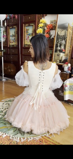 Delicate tulle ruffles at the hips echo the flutter of swan’s wings, catching the light with every movement. Shaped in a romantic hourglass, the design offers a lifted, elegant bustline and a cinched waist, recalling the ethereal beauty of a ballerina poised in arabesque.