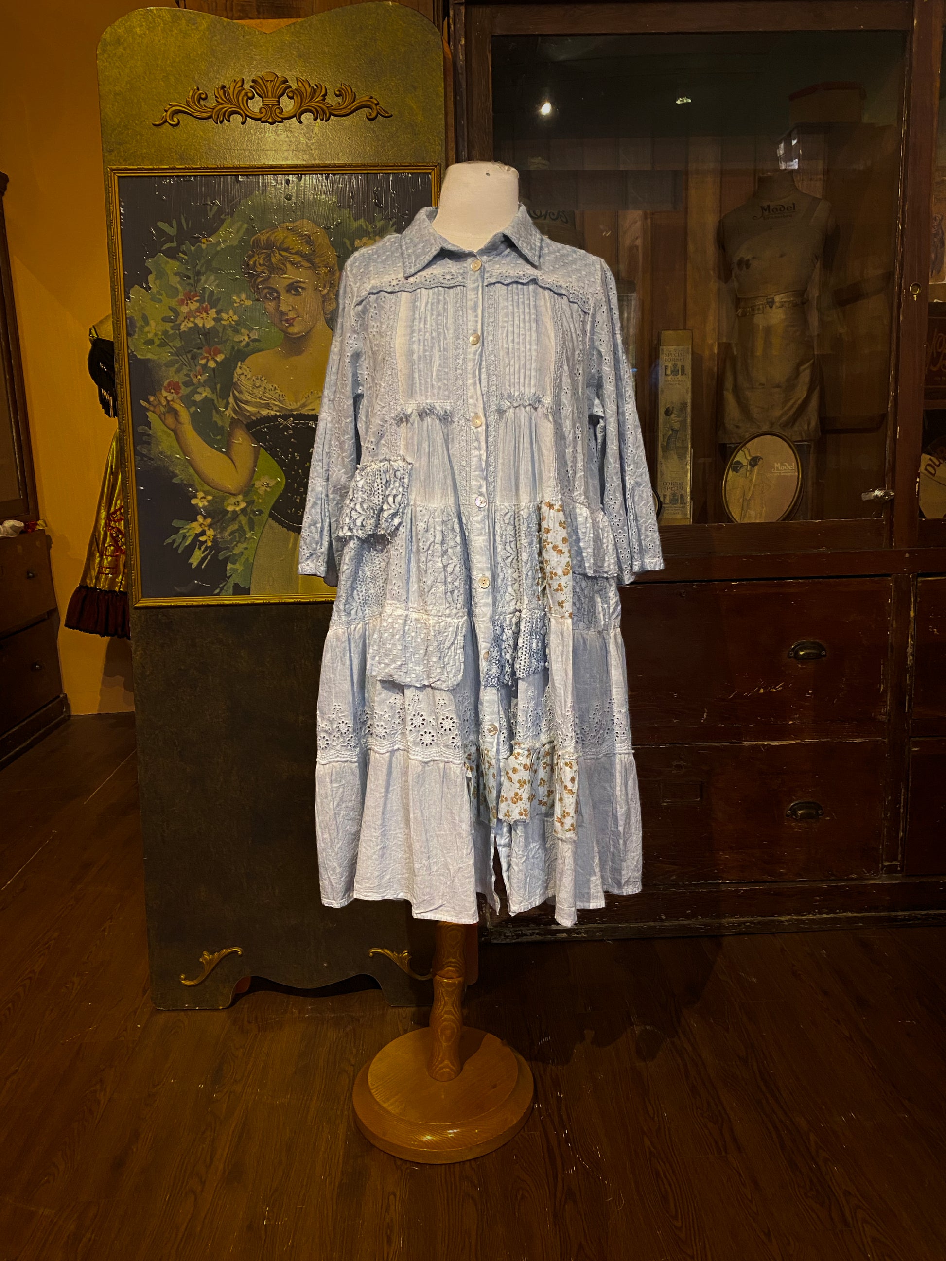 The button-front design and loose, flowing silhouette make them easy to wear as a dress or layered open as a duster. Whimsical patchwork pockets and subtle floral accents add a touch of individuality to each piece, while the washed finish lends a soft, lived-in feel.