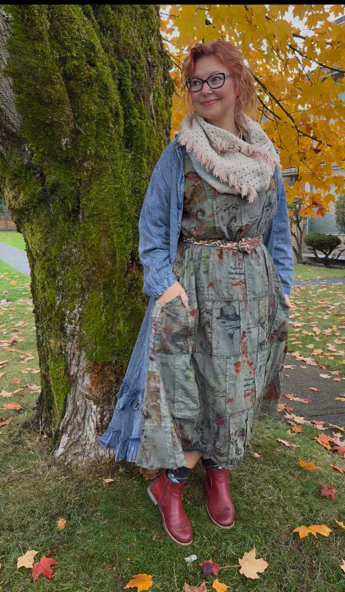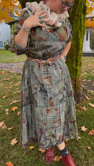 Each panel is individually printed and pieced, forming a patchwork of story-filled fabrics that evoke the beauty of aged paper and pressed flowers. The A-line silhouette drapes softly from the shoulders, creating a comfortable yet elegant shape that flatters all figures.