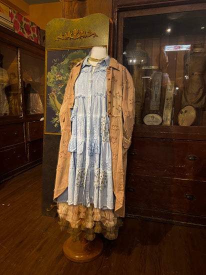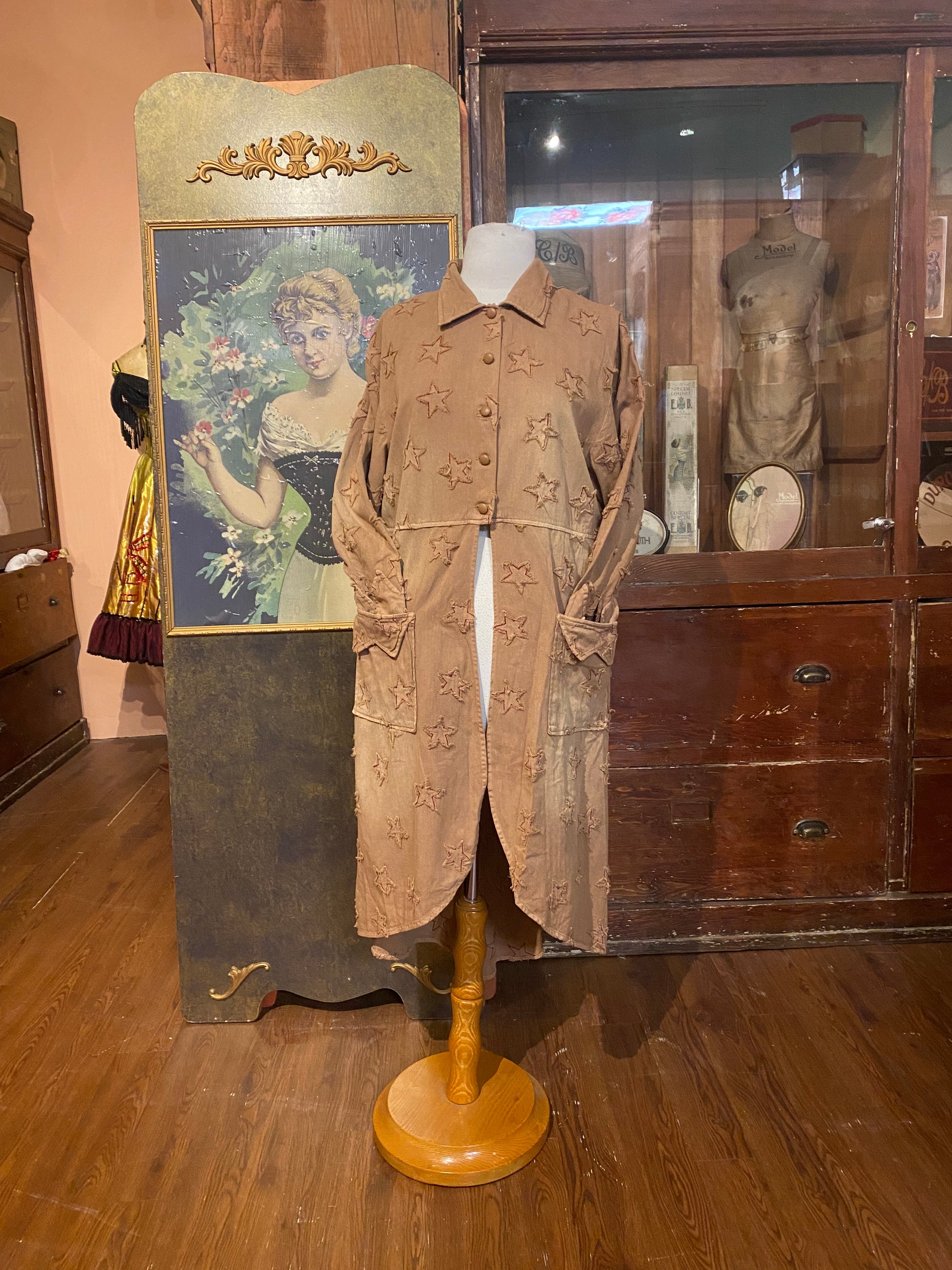 A touch of celestial whimsy meets bohemian ease in this Star Coat β a lightweight, softly structured layer that adds instant charm to any outfit. Crafted in a washed tawny tan denim cotton, it features hand-appliquΓ©d stars scattered across the surface, giving it a dreamy, handcrafted texture.