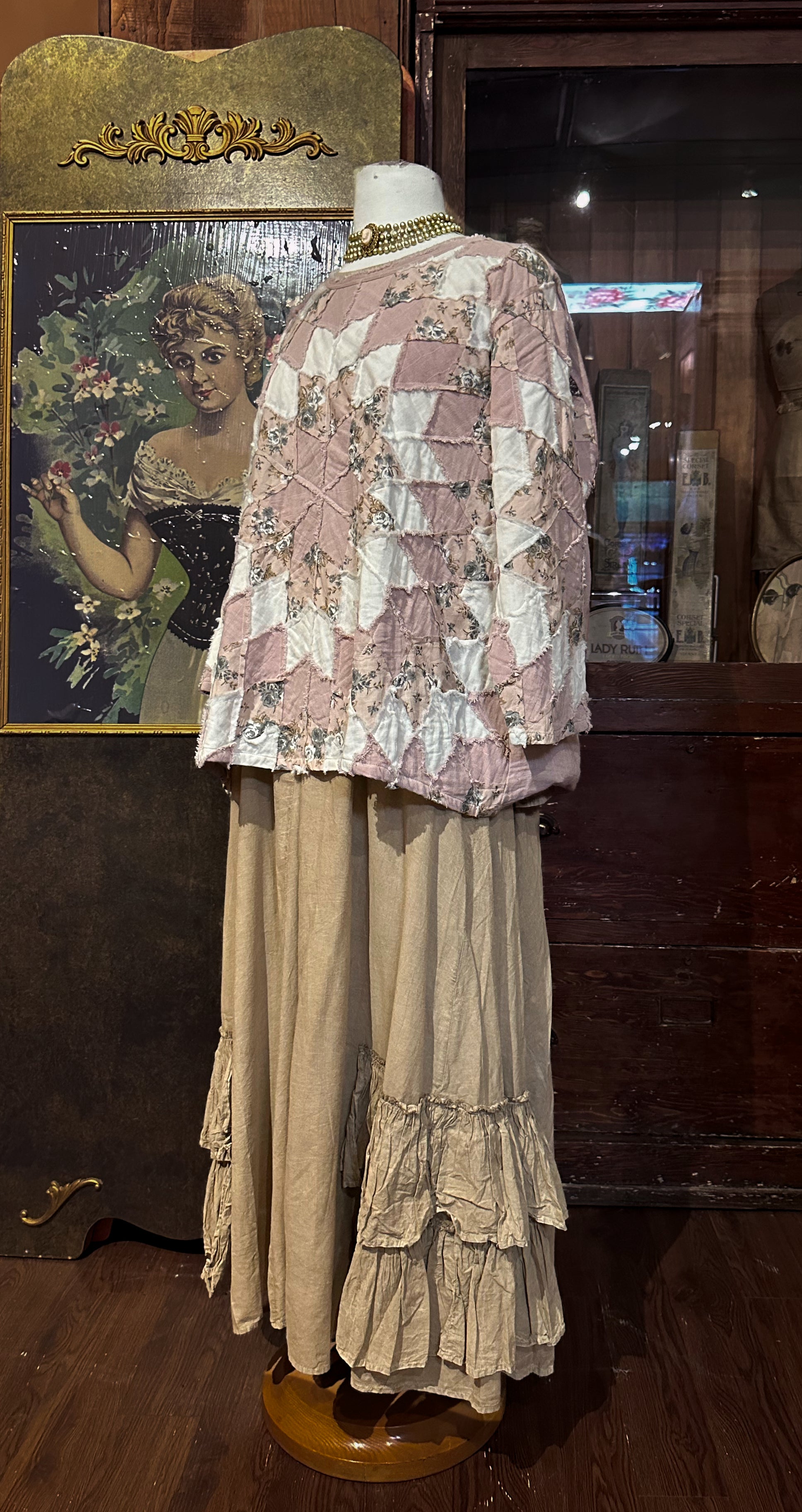 Soft, cozy, and effortlessly romantic β this cotton patchwork sweatshirt combines comfort with handcrafted charm. Designed with a relaxed silhouette, each piece is lovingly pieced together in a geometric patchwork of rose, ivory, and floral cottons, creating a look that feels both nostalgic and modern.