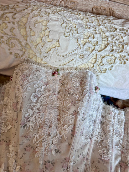 Nestled upon its surface are ribbon roses, lovingly hand-stitched, each one a nod to 19th-century millinery and the romantic embellishments once reserved for the trousseaux of noble brides. Pearls nestle below soft net trimβsymbols of purity and wisdom, long associated with femininity and devotion.