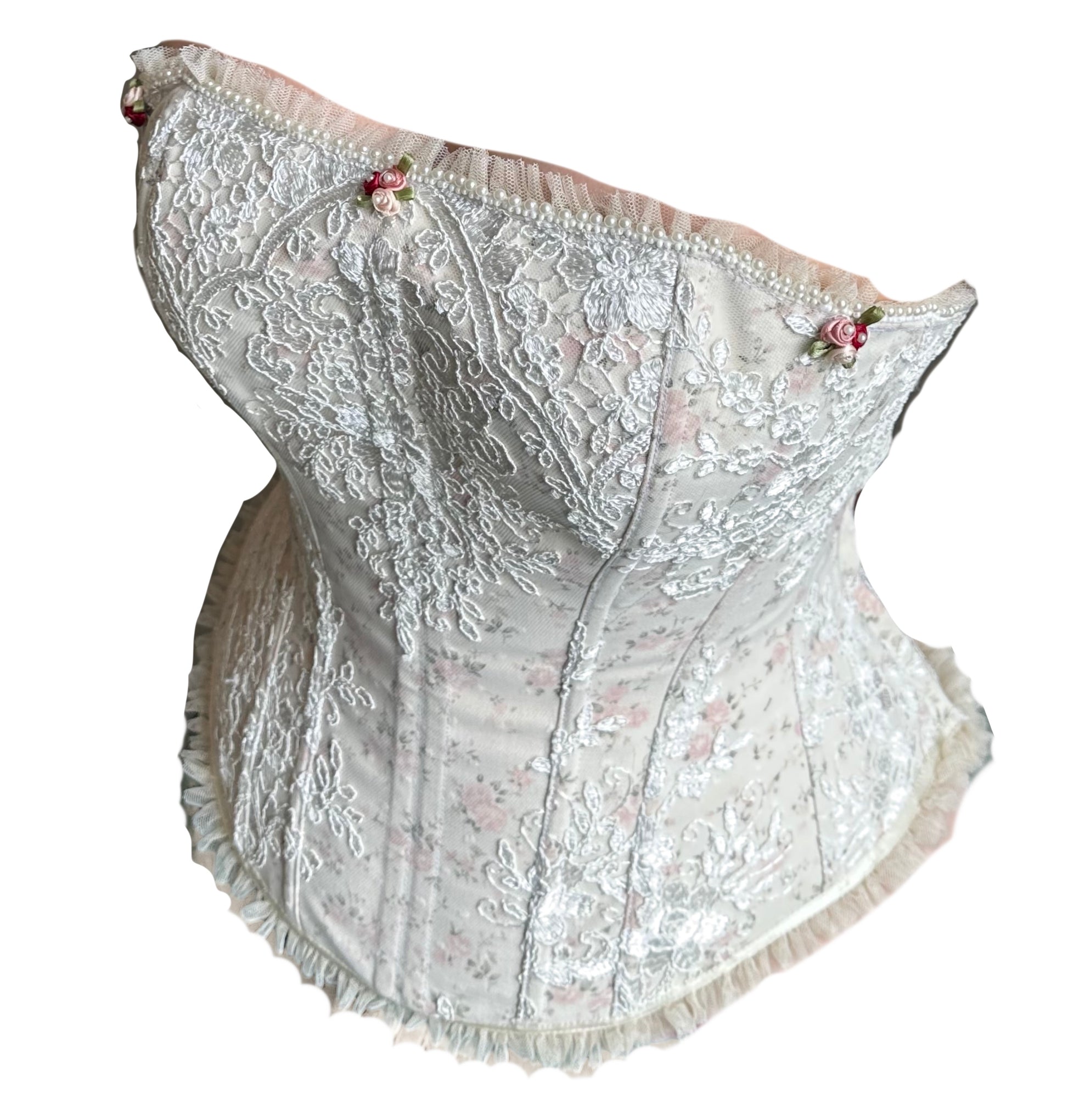 Soft as a whisper and rich in delicate details, this corset is a tribute to love stories whispered through time. Its silhouette is sculpted in delicate white floral lace overlaying soft pink rosebuds, blooming like frost-touched petals across a snow-white garden at dawn.
