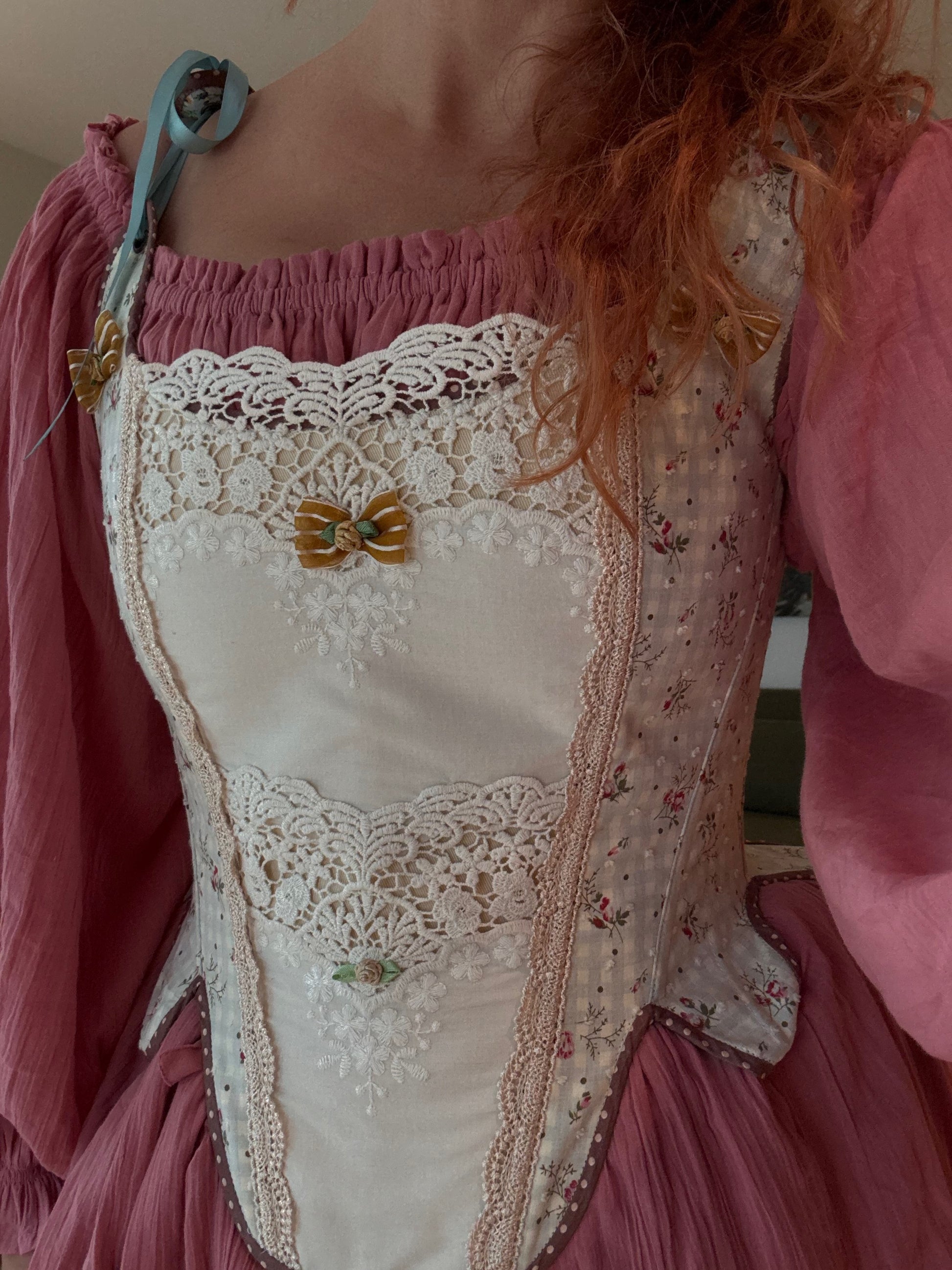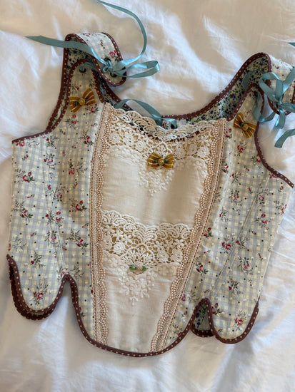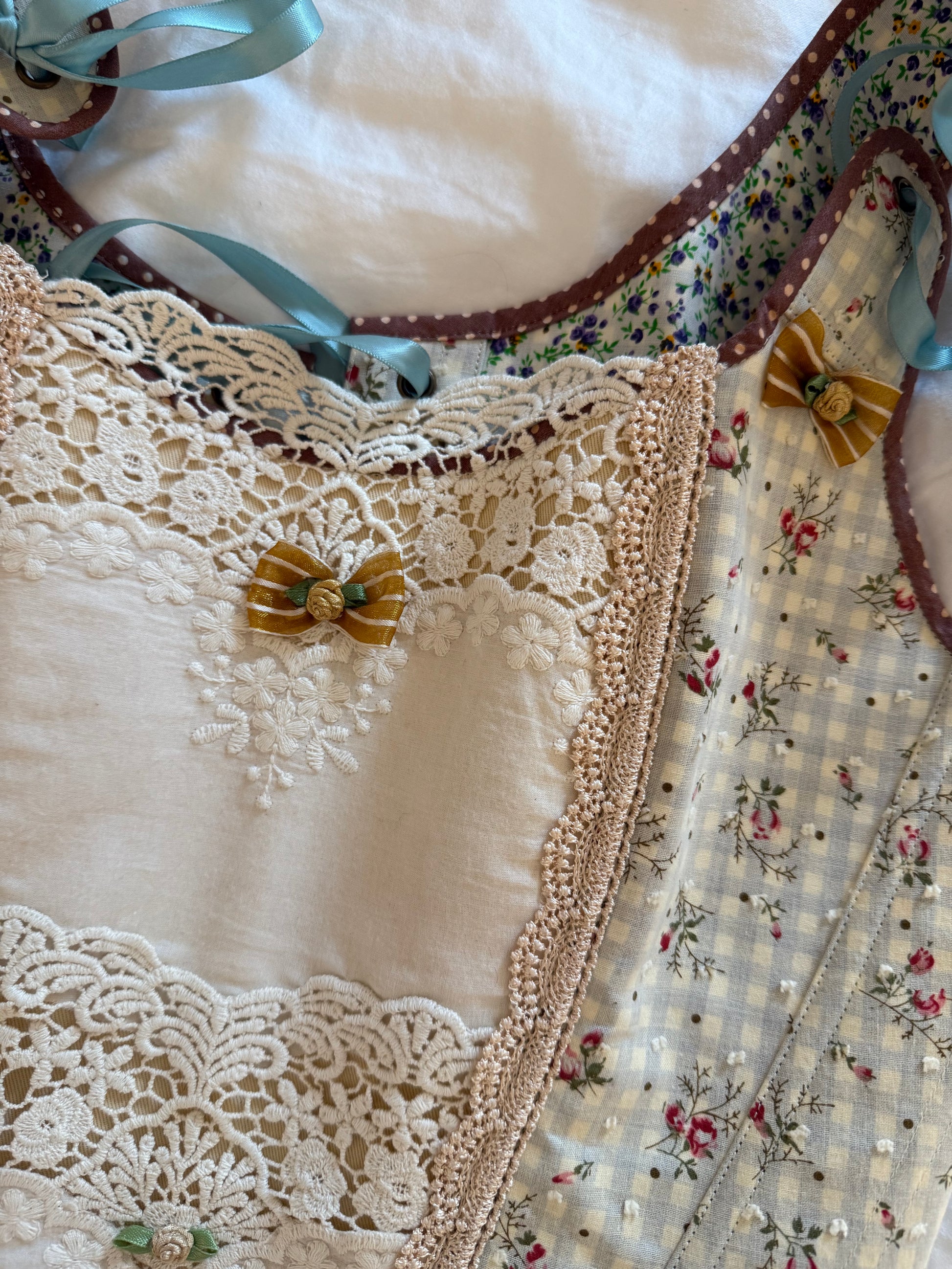 Step into a daydream of rustic charm and vintage romance with our Madeline Stays, a piece that whispers of country picnics and sunlit meadows. Blooming with delicate rose-sprigged florals on a soft gingham ground, an embroidered panel adorned with vintage lace graces the bodice,