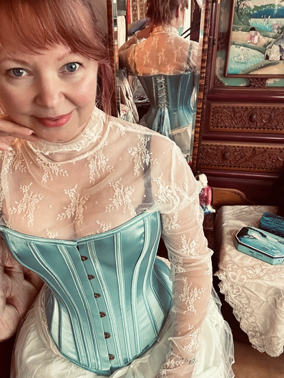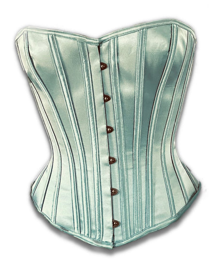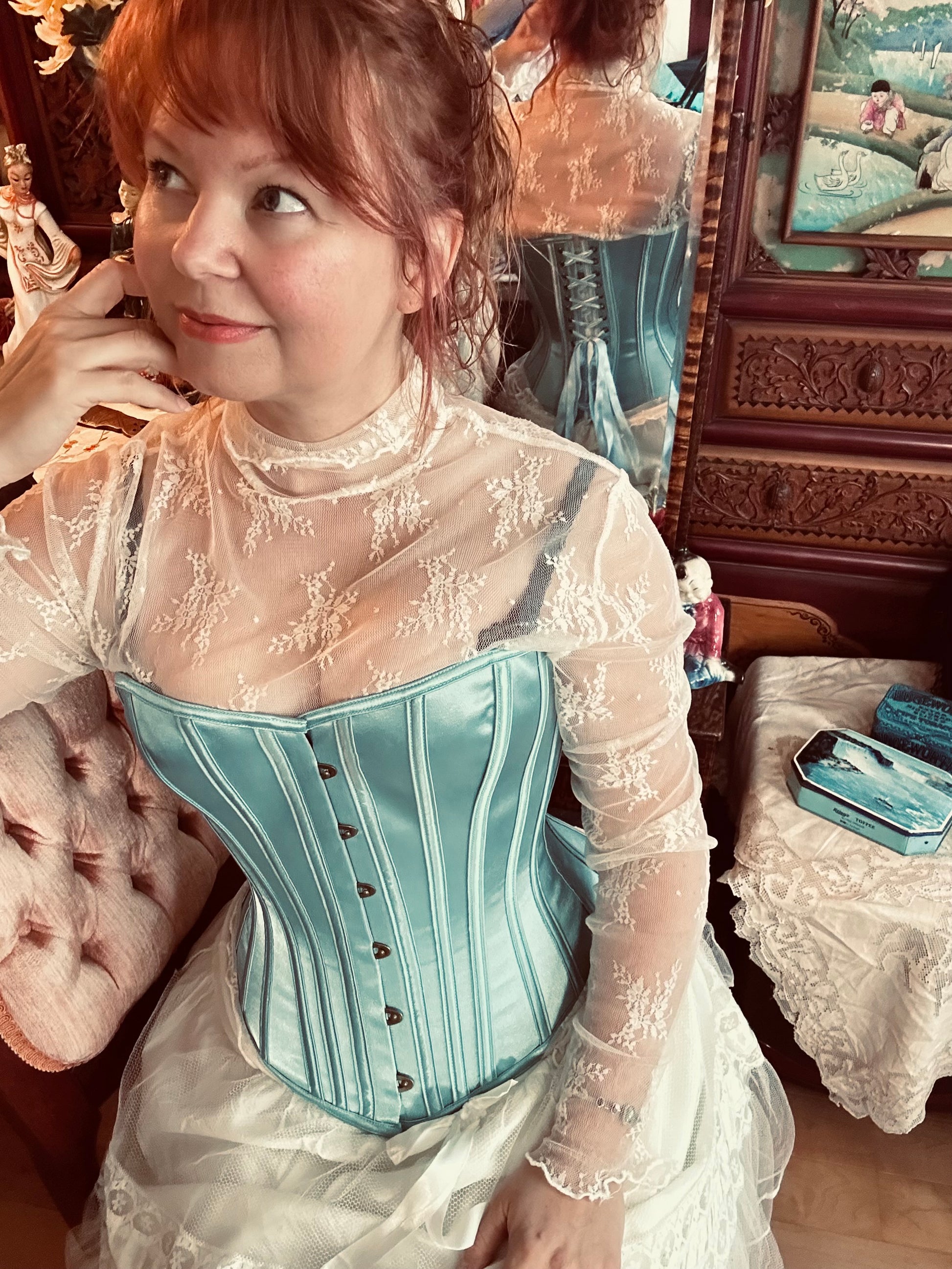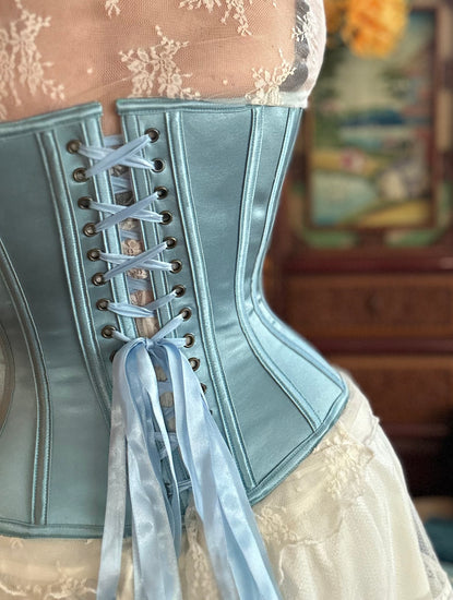 The Sibelle Corset is a beautifully structured Victorian mid-bust corset, bridging the transition between Victorian and Edwardian corsetry (c. 1900). Crafted in a dreamy vintage robin’s egg blue satin, this corset is the perfect “something blue” for your wedding day or a historically inspired foundation garment for period dress enthusiasts.