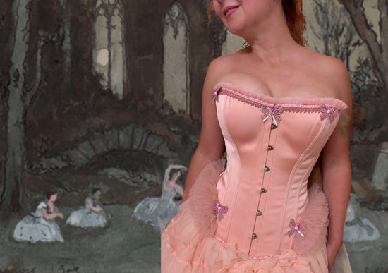 This corset belongs to a sylph, a spirit of air and longing. In Les Sylphides, the ballerinas drift like petals on the breeze, ephemeral and graceful—dancing not for story, but for mood. The soft rose hue and fluttering texture capture their otherworldly gentleness.