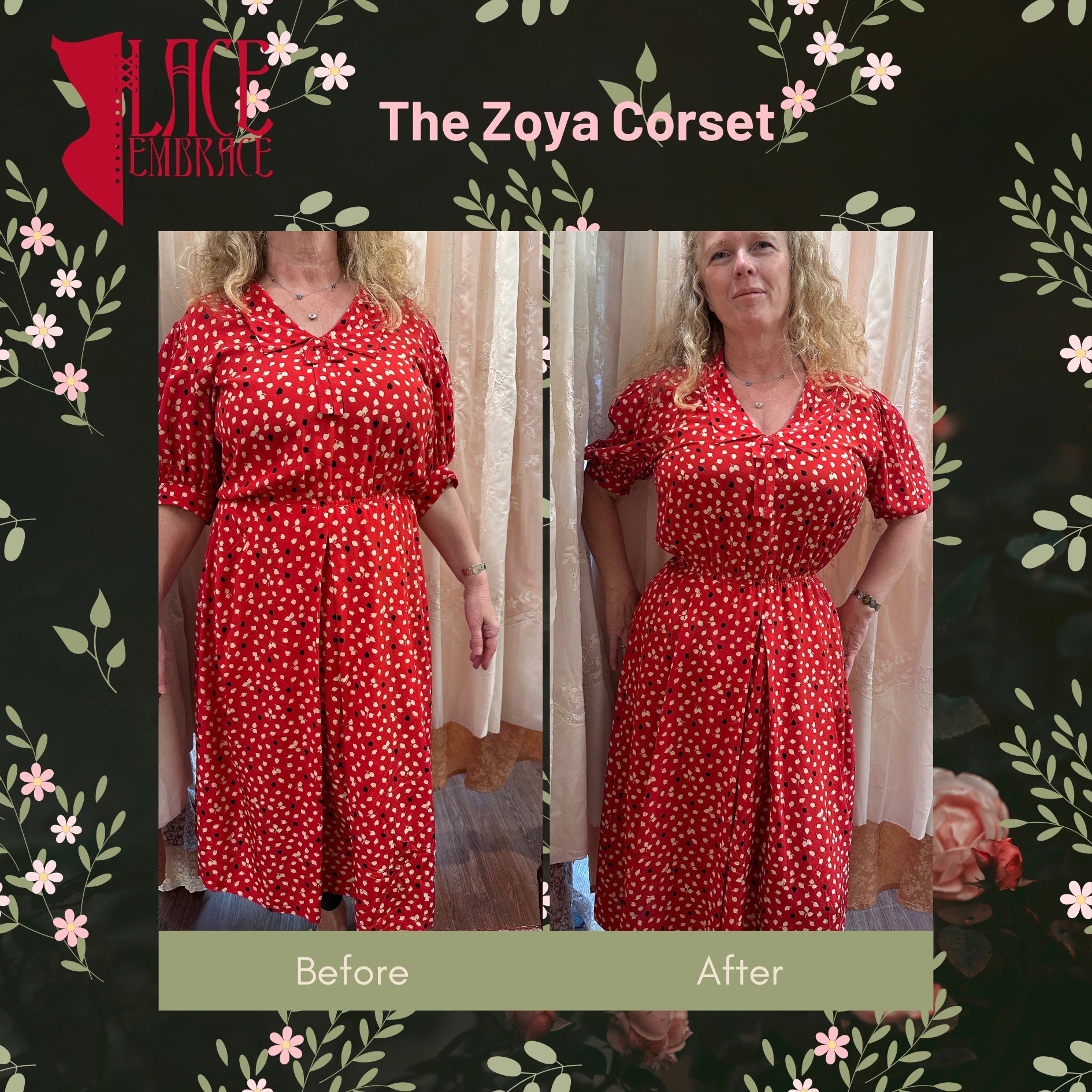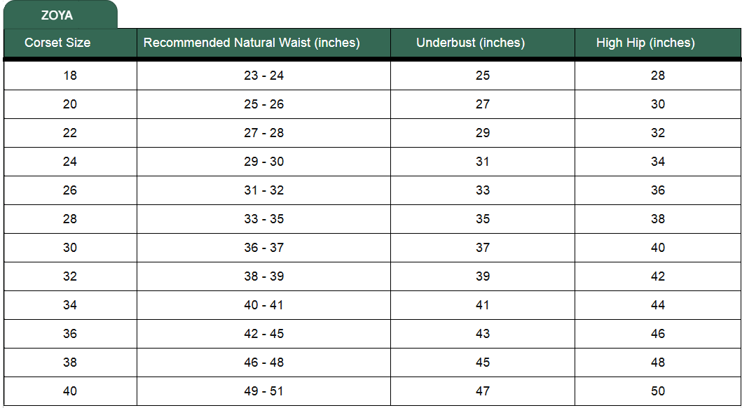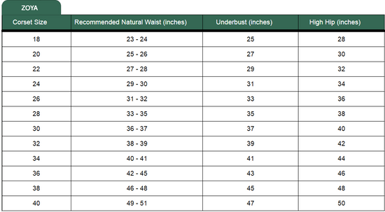The Zoya is ideal for folk who want to define their waists while still benefitting from soft, flexible support. We recommend sizing down to a corset size that is 6 inches smaller than your natural waist measurement.